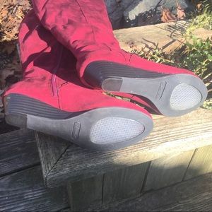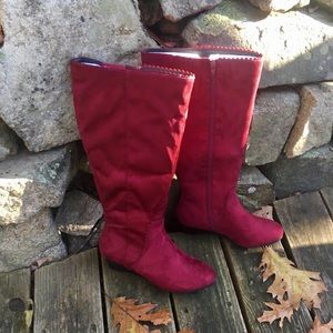 Timeless vibrant burgundy suede-like boots with a comfortable low heel