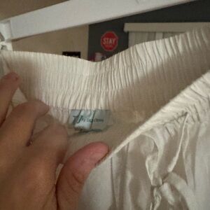 Chic white circle skirt. Blue floral embroidery along hem. Features tassel ties.