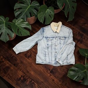 Classic wide-leg silhouette with a relaxed fit. Medium blue denim with subtle fading. Five-pocket style and zip-button closure. Versatile and easy to pair with tops.