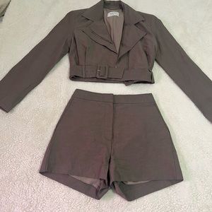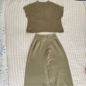 Chic tan knit set with cozy top and matching bottoms. Perfect for casual wear.