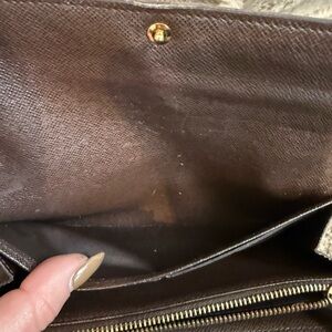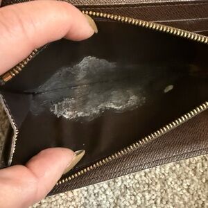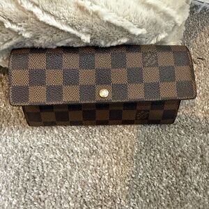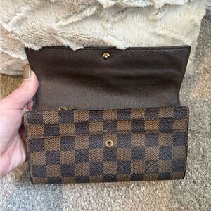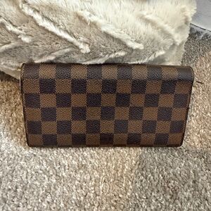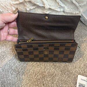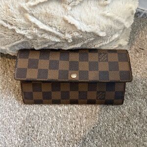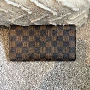 Classic Louis Vuitton Damier Ebene crossbody wallet. Checkerboard canvas in rich brown tones. Gold-tone chain strap for elegant carry. Sleek flap front with snap closure. Perfect for hands-free style. In great condition minus the change pocket (see pictures) Make me an offer!