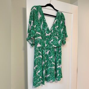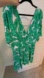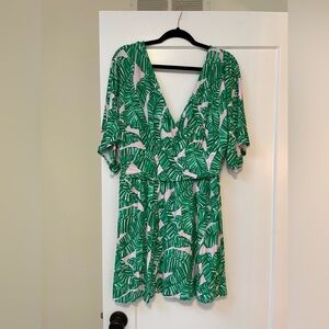 Green floral cotton (94% Rayon, 6% Spandex). Romper. Short sleeves. V-neck. Pull on. 17" from shoulder to hemline. Imported.