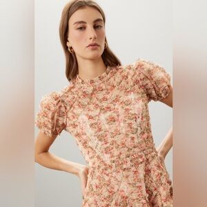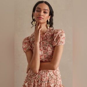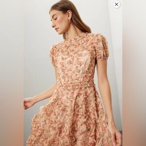 This high-neck floral maxi dress features layers of airy mesh ruffles that create soft movement with every step. The fitted bodice balances the volume of the skirt, while the high neckline and short sleeves keep the silhouette elegant and refined. Finished in a delicate pink and cream floral palette that photographs beautifully for daytime and evening events alike.
