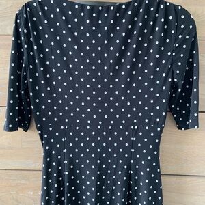 Chic black midi dress with white polka dots. Features a flattering draped design. Ideal for versatile styling. Stretchy material fits size 4-6 best. Super cute still has a lot of life in it looking for a new home!