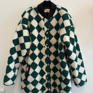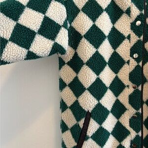 Cozy teddy jacket with bold checkered pattern in green and white. Great mid-weight layer, some wear but still a lot of life left in it!
