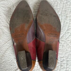 Nicole multicolor patchwork leather heels with a pointed toe. Soft leather upper combines green, brown, burgundy and tan panels for versatile style. Cushioned insole provides all-day comfort. Easy slip-on design for everyday wear.