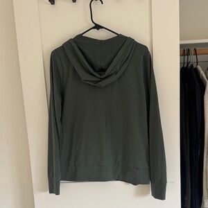 Lightweight zip-up hoodie in green. Features front pockets and a full zipper. Drawstring hood and ribbed cuffs. Simple everyday layering piece. Vuori size L
