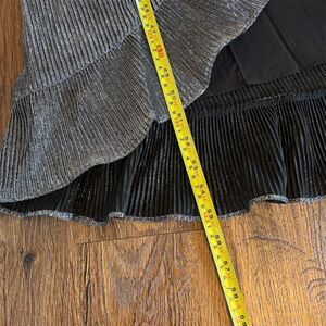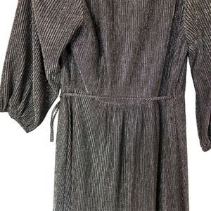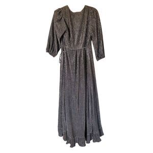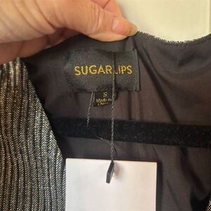 The Sugarlips dress is a long, black wrap-style garment featuring ruffle accents and a V-neckline. Made from shimmer fabric, it has long sleeves and a faux-wrap design with a tie waist. Ideal for party or cocktail occasions, this dress is designed for women and requires hand washing. The dress is new with tags.