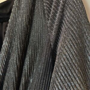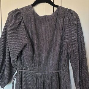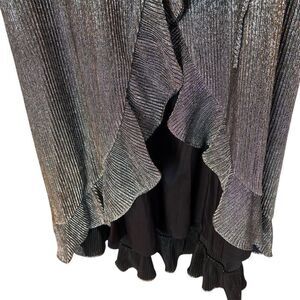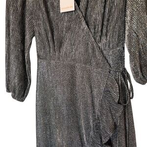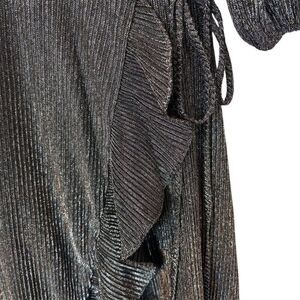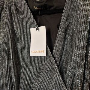 Keywords: Sugarlips, wrap dress, ruffle, long dress, black dress, shimmer fabric, V-neck, party dress, cocktail dress, women's fashion, long sleeve, tie waist, faux-wrap, hand wash, new with tags.