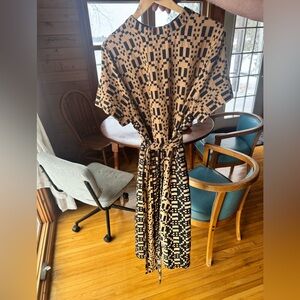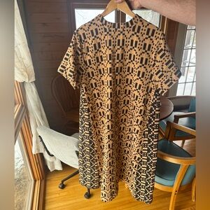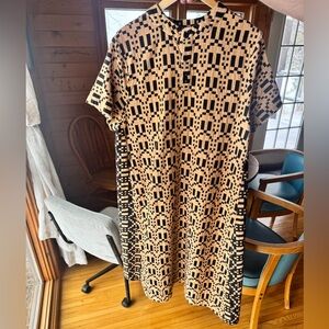 A relaxed midi dress with short sleeves and a crew neckline. Bold geometric pattern in contrasting colors. Thicker woven fabric with an easy, flattering drape. Versatile for casual or dressed-up looks.