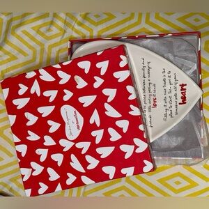 White heart-shaped ceramic plate with red lettering and accents. Brand: . Elegant decorative plate for serving treats or gifting. Features red 'heart' and 'love' details for a warm, sentimental look. Easy to display or use as a charming keepsake.