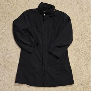 Classic black men's overcoat with a clean, streamlined silhouette. Lightweight yet durable fabric for year-round wear. Features a high collar and concealed front closure and hidden hood in collar. size L