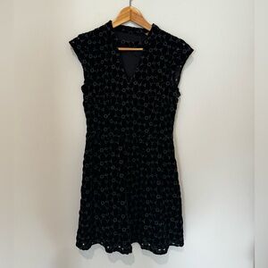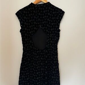 Black velvet mini with subtle floral pattern. Cap sleeves and a flattering fitted waist. Slight V-neck and short A-line skirt. Open back. Luxurious velvet gives a rich look.