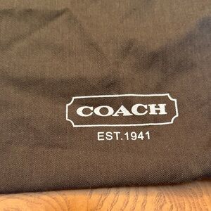 Coach branded drawstring dust bag. Black fabric with red drawstring and side trim. White Coach logo printed on front. Lightweight and travel friendly. H15xL19"