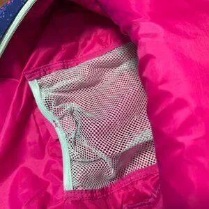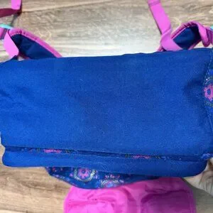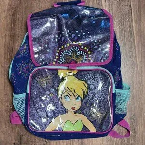 Authentic Disney Store Tinker Bell backpack with purple glitter panels and fairy artwork.