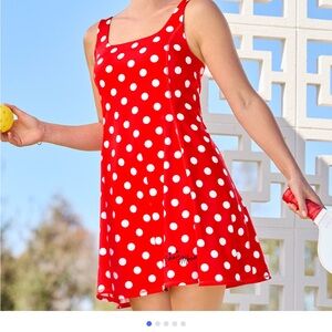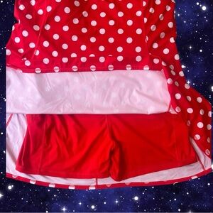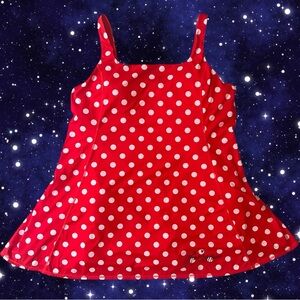 EUC. This dress is amazing. Hard to find size. The construction is beautiful. Polyester and spandex. Built in shorts, pockets and removable bra pads. Minnie’s signature at hem. Comfortable slip on style. Perfectly bright red with white polka dots. Mid thigh length and flared skirt. This dress could get wet and dry quickly - perfect for Florida park visits especially. All you need are some Minnie ears. You will look and feel your best!