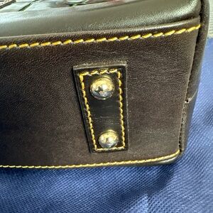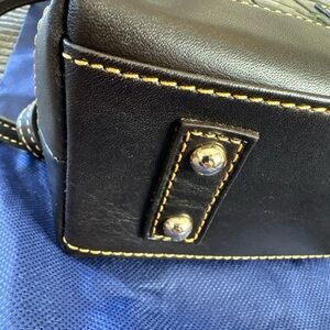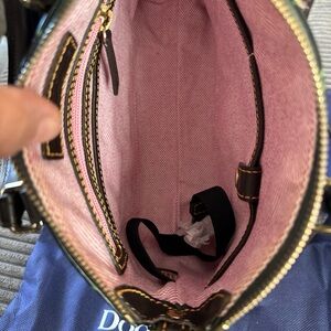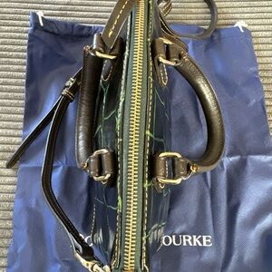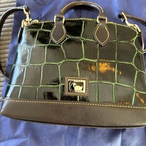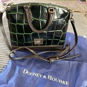 Dooney & Bourke satchel in croc-embossed leather. Shiny black body with green grout detailing. Dark brown trim and handles. Top zip closure and adjustable crossbody strap. Polished gold-tone hardware and logo plaque.