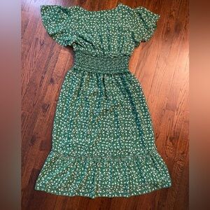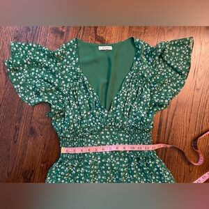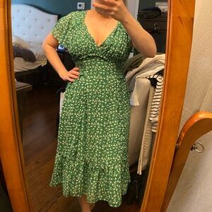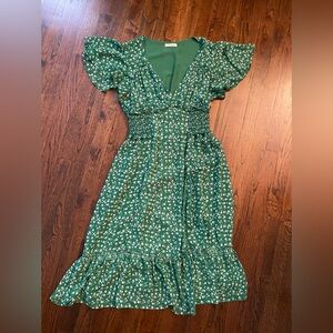 Charming lightweight springy vibrant green midi dress with white floral pattern. Features flutter sleeves and a v-neckline. Partially lined. Super cute but too tight in the chest area for me. Would be great for bridal/baby shower guest, graduation ceremonies, parties or a fun weekend lunch date!