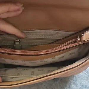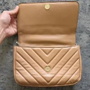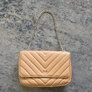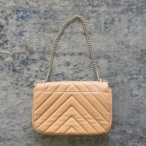 Chic DKNY shoulder bag with chevron quilting. Smooth beige leather-like exterior. Small gold DKNY logo on front. Gold chain shoulder strap adds shine. Versatile, elegant design for everyday wear.