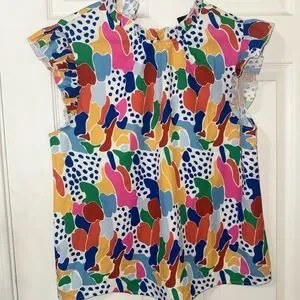 Bright multicolor abstract print top with cap sleeves and a mock ruffle neckline. Lightweight, breathable fabric that layers easily. Vibrant blue, pink, green, yellow and orange hues add a bold pop to any outfit.