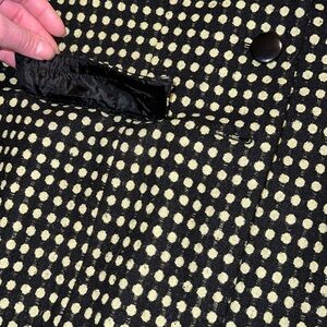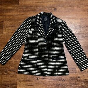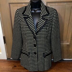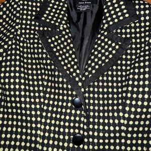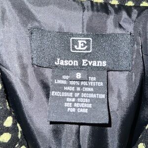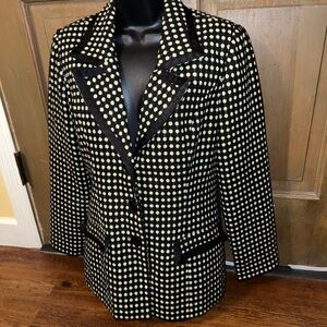 Jason Evans black with green polka dot pattern long sleeve blazer with front flap pockets and 3 front buttons and shoulder padding