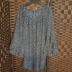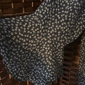 Lightweight peasant blouse with a relaxed fit. Features small white floral print throughout. Scoop neckline and long bell sleeves. Soft, flowy fabric for easy wear. Versatile for casual or dressed-up looks.