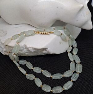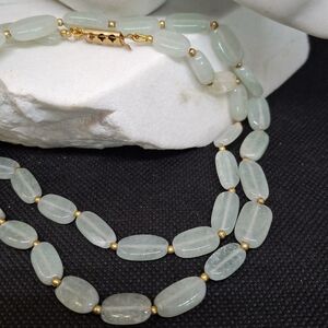 Pale green beaded necklace with polished gold-tone spacer beads and clasp. Soft, soothing green beads create a refined, wearable look. Designed for effortless layering or single-strand elegance. Gold accents add a warm, upscale finish.