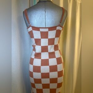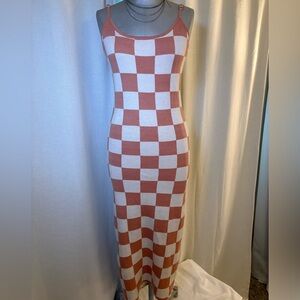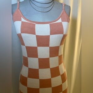 Soft, stylish, and effortlessly eye-catching, this unbranded checkerboard sweater dress features a warm peachy blush and cream color palette in a bold oversized check pattern. Designed with a flattering body-skimming silhouette, this knit dress has adjustable spaghetti straps, a scoop neckline, and a stretchy sweater-knit construction that hugs comfortably while still feeling soft and easy to wear.