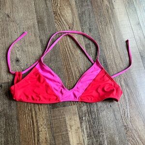 Two-tone triangle bikini top by Carve Designs. Bright pink and hot pink color block. Thin adjustable straps. Smooth, stretchy swim fabric. Simple, sporty silhouette.