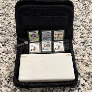 White Nintendo DS with five game cartridges. Comes with a black carrying case. No charger included. Six games: littlest pet shop, Barbie horse, adventures, puppy palace, imagine interior designer, Rubik’s world, imagine rockstar.