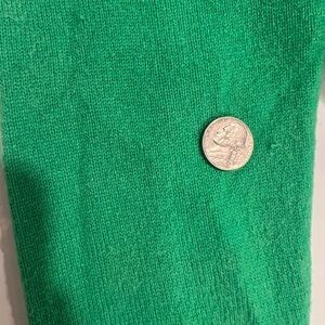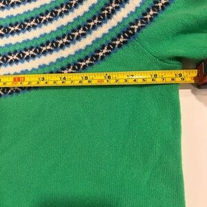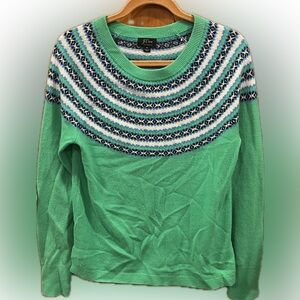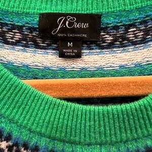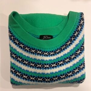 J. Crew 100% cashmere crewneck sweater featuring a vibrant green base. Fair Isle stripes in blue, navy, and cream create a classic patterned look. Soft knit fabric offers cozy wear. Small pulls on right sleeve as seen in pictures. Overall excellent condition.