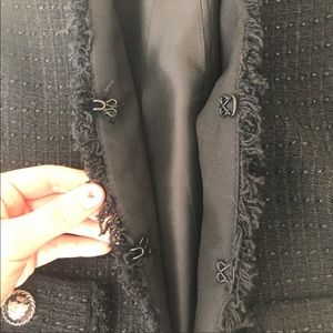 Tweed blazer, v neck, hook and eye closure, 2 pockets, gold black buttons