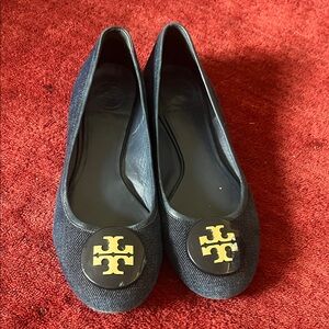 Very good condition!! Chic navy flats featuring iconic gold Tory Burch logo. Ideal for versatile styling. Tory Burch Quinn Ballet Flats Denim Navy