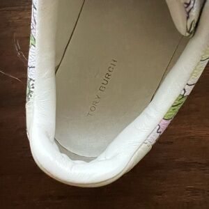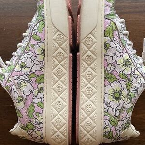 Stylish Tory Burch platform sneakers. Features floral pattern. Pink and green accents. Comfortable and chic.