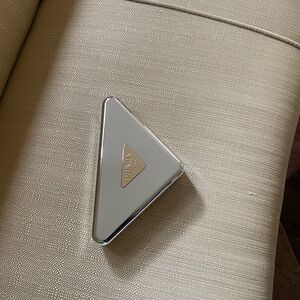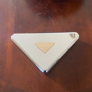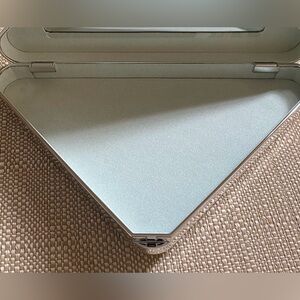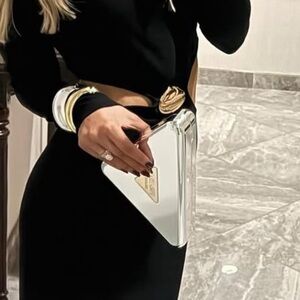 Stylish Prada clutch in a unique triangle shape. Features a sleek silver design with gold accents. Sold out online. In amazing condition worn only twice - pictured above for inspiration. Comes with original box.