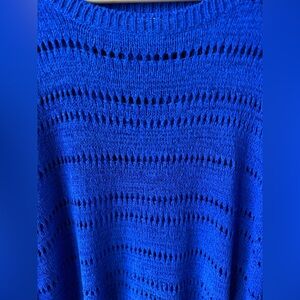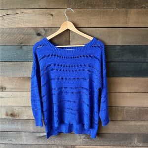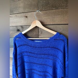 Bright cobalt blue open knit sweater by August Silk with a relaxed drape and wide boat neckline. Lightweight knit with subtle openwork stripe detailing throughout. Slightly oversized with a soft drop shoulder and easy fit, making it perfect for layering.