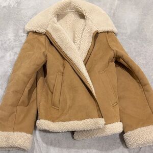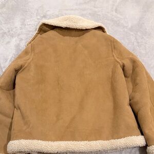 Cozy teddy jacket by Uniqlo. Features a tan exterior with cream sherpa lining. Perfect for warmth and style.