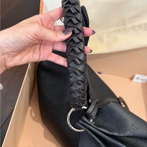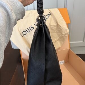 Louis Vuitton Carmel Handbag in black. The Carmel hobo bag is a spacious, lightweight style in Mahina calf leather with Monogram perforations. The supple leather and the soft form of the bag combine to make it exceptionally pleasant to carry. Craft details such as the braided handle and LV leather charm add to the sophistication of this bag!