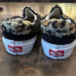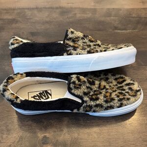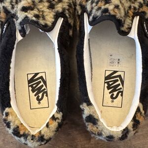 Vans Leopard-Pattern Fuzzy Slip-On Shoes in Black, Tan, Cream