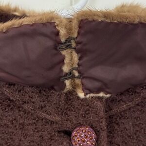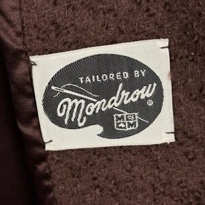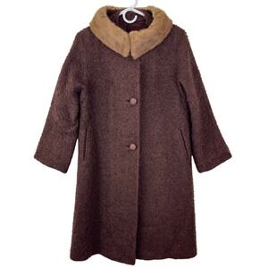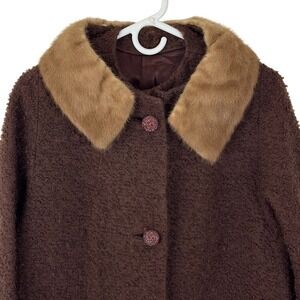 Vintage 1960s wool bouclé coat Tailored by Mondrow, union made in the USA with an ILGWU label. Features a rich brown textured wool exterior, elegant A-line silhouette, statement buttons, and a luxurious fur collar. Fully lined with side pockets. A beautiful mid-century winter coat with classic Jackie O elegance. Perfect for creating a retro glam or winter formal look.