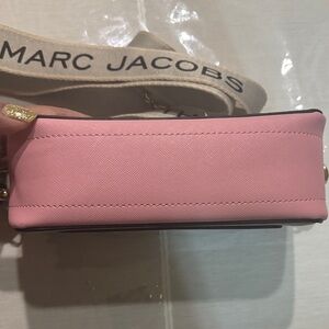 Chic crossbody bag by Marc Jacobs. Features a pink and gray design with a bold logo strap. Gold hardware adds elegance.