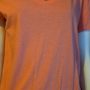 Soft coral V-neck tee with short sleeves. Lightweight, breathable cotton blend. Simple, versatile silhouette for everyday wear. Worn once.