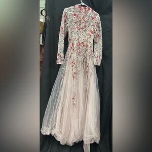 Step into elegance with this stunning floral embroidered gown. The delicate pink hue adds a touch of sophistication, perfect for any special occasion.