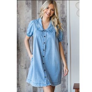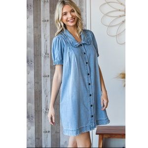 Chic and casual, this blue denim mini dress is perfect for any occasion. Featuring a button-down front and stylish puff sleeves, it's a must-have for your wardrobe.