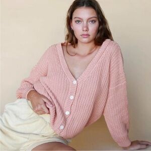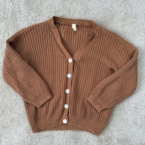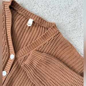 Cozy waffle knit cardigan in warm brown. Features a V-neck and button-front closure for versatile layering. Soft, textured fabric offers comfortable everyday wear. Brown color adds a neutral, stylish touch to any outfit.
