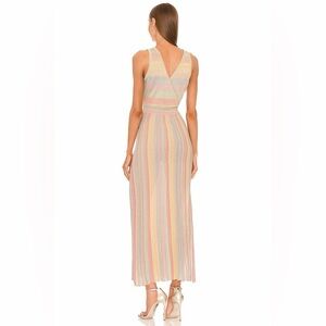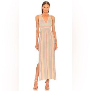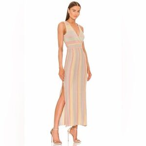 Channeling your inner sun goddess in the new Mylene Dress in Rayon, the new spaced-dyed yarn. This solid mixed yarn print is detailed with a regal, gold lurex, and sparkles throughout. Featuring a deep v center front and center back with surplice detail. This occasion dress is designed with engineered pleats in the skirt with a slit on the wearer's right for a statement moment.