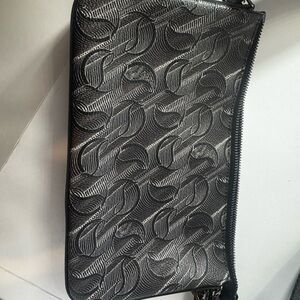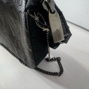 Sleek Christian Louboutin crossbody belt bag. Textured black body with embossed pattern. Adjustable black strap for hands-free wear. Round coin pouch with signature logo. Red leather tag accent adds bold contrast.