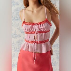 Stylish pink and red sheer camisole top with delicate straps and tie details.