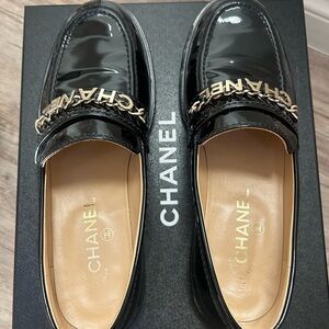 Stunning and iconic Chanel loafers in glossy black patent leather. Features the signature gold-tone CHANEL chain lettering across the front for a standout, timeless look. Classic, sophisticated, and chic — perfect for elevating any outfit from casual denim to tailored trousers.