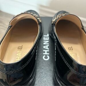 CHANEL Patent Leather Chain Logo Black Loafers – Size 39.5